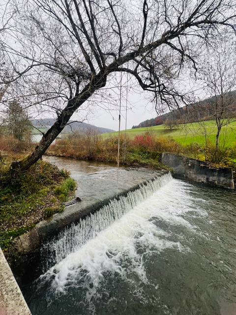 Ein Stück Geschichte, ökologisch eingebettet in den heutigen Flusslauf. Das Wehr könnte als Krebssperre fungieren gegen invasive Arten und bietet im Hochsommer den Kinder in Detzeln .ein kleines Freibad.