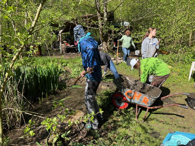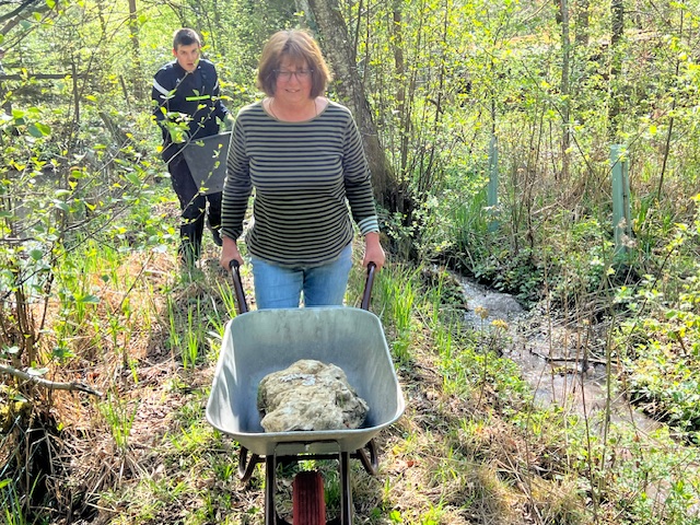 Lehrerin Rita Mandock und Organisatorin der Projektwoche griff selbst zur Schubkarre und zeigte eindrucksvoll, wie der Damm zwischen Lernteich und Fockeltenbach zu reparieren ist. Foto: Verein