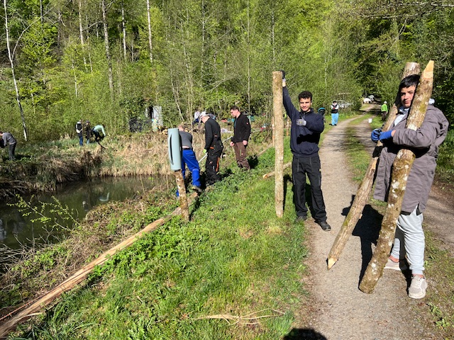 Schüler lernen wie ein ökologisches Geländer am Karpfenteich erneuert wird. Foto: Verein